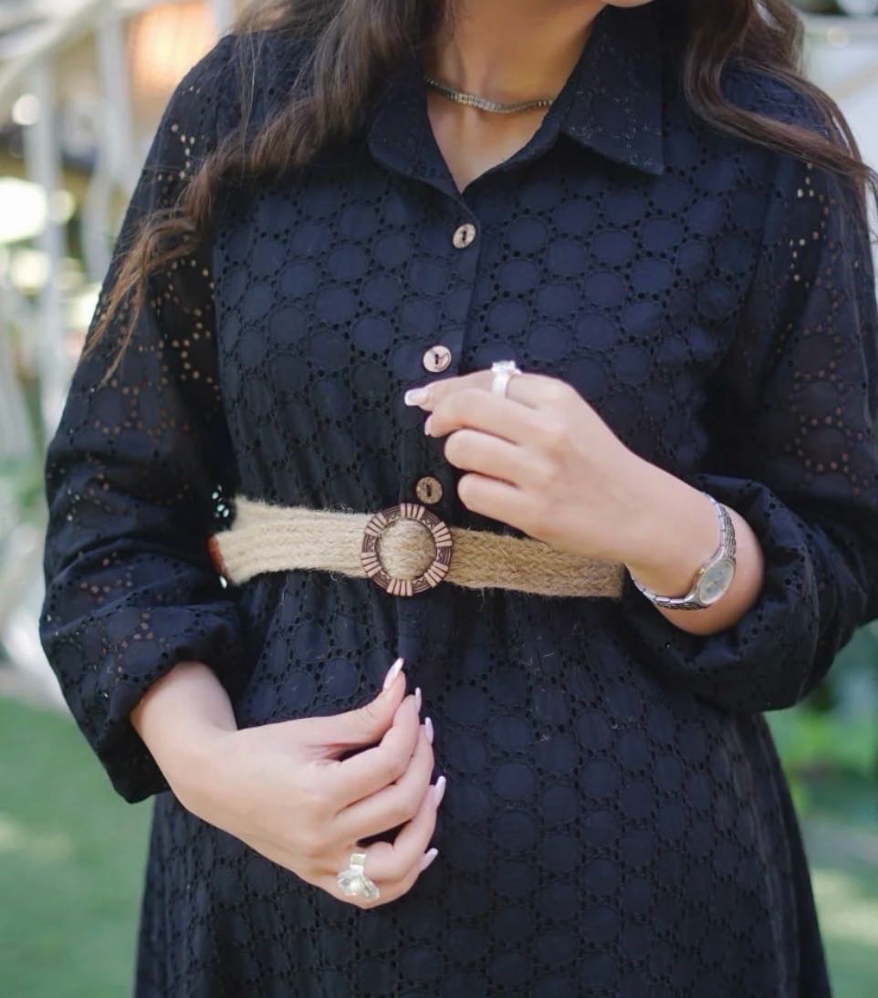 یکی از نقاط قوت این مدل، وجود کمربند کنفی زیبا و قابل تنظیم است. این کمربند قابلیت بسته شدن هم در جلو و هم در کنار را دارد و این امکان را به شما میدهد: